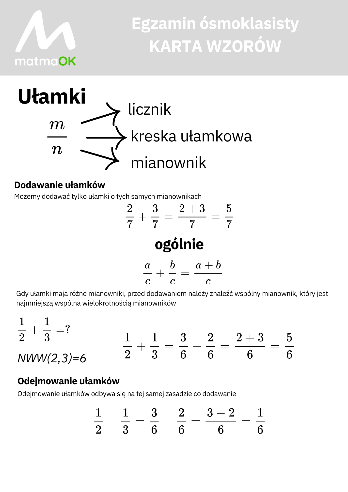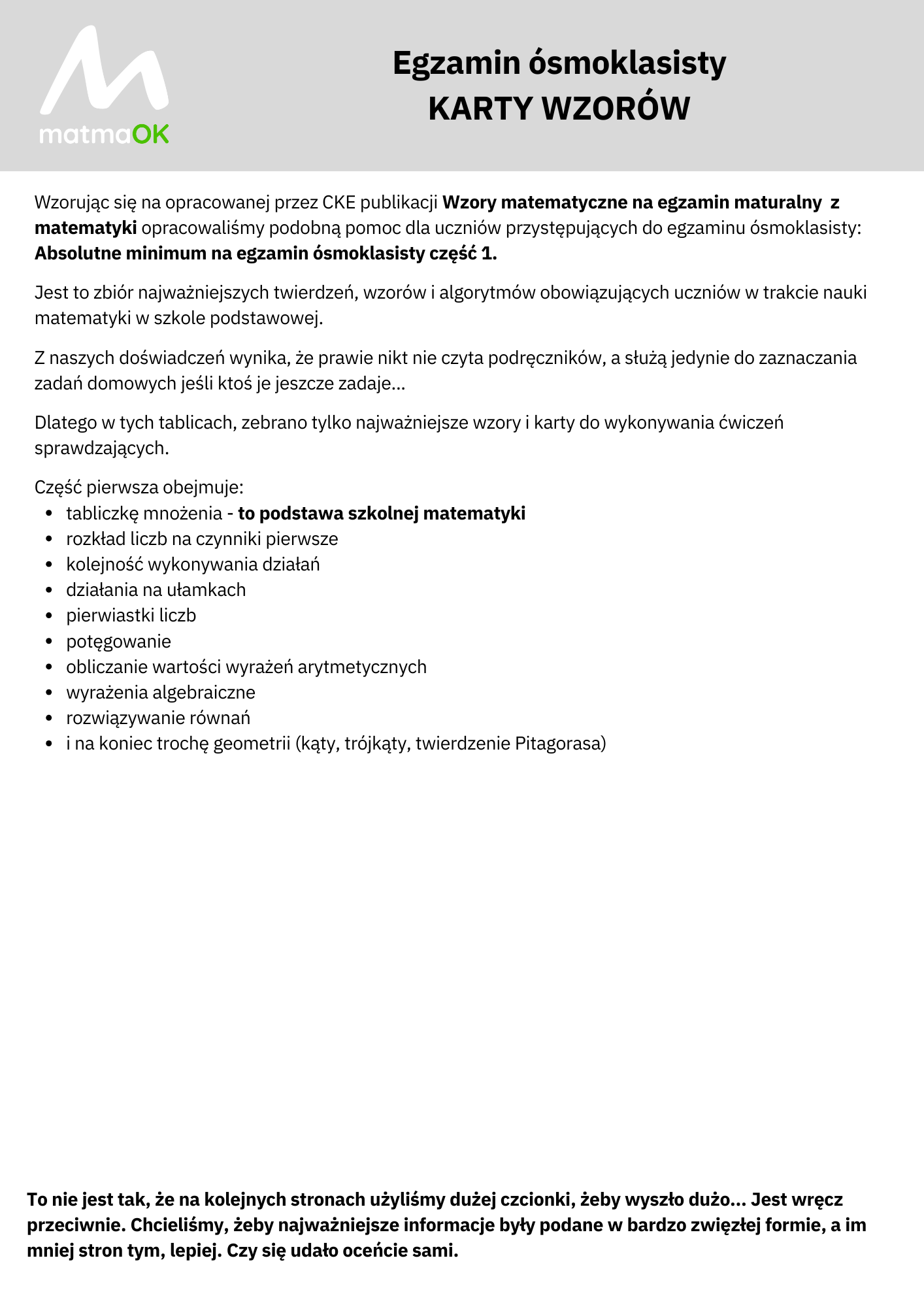 Zainspirowani formatem CKE dla maturzystów („Wzory matematyczne…”) przygotowaliśmy analogiczną, skondensowaną pomoc dla 8-klasistów. Idealna do szybkich powtórek, nadrabiania braków i utrwalania podstaw.