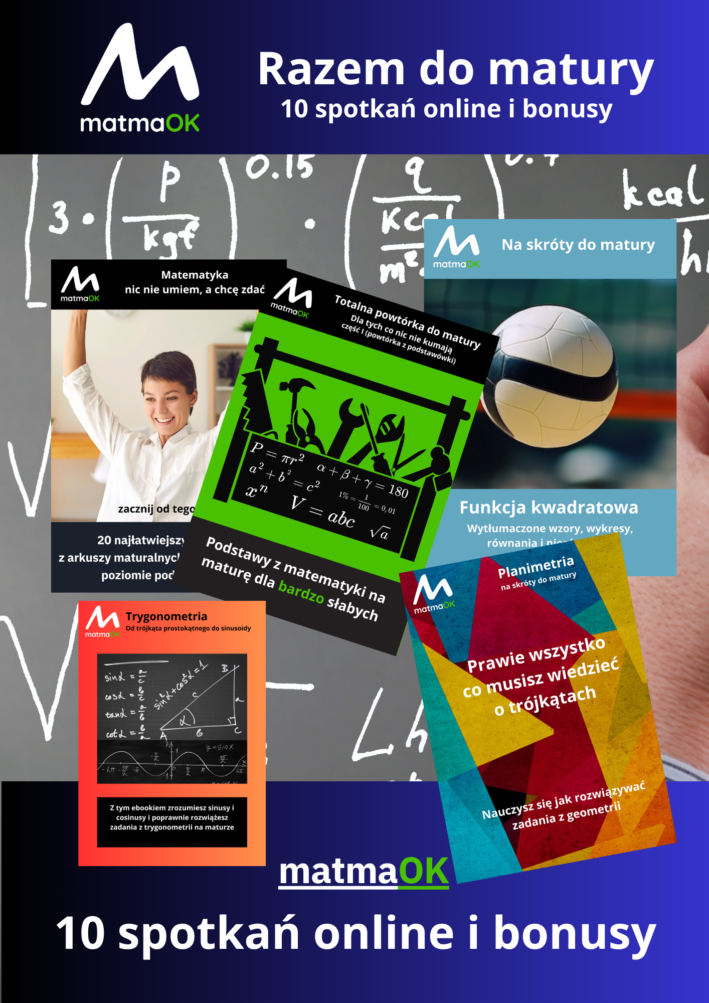 - dostęp do platformy kursowej kursy.matmaOK.pl - tam znajdziesz krótkie opracowania poszczególnych działów, komentarz wideo do wybranych tematów oraz testy online,